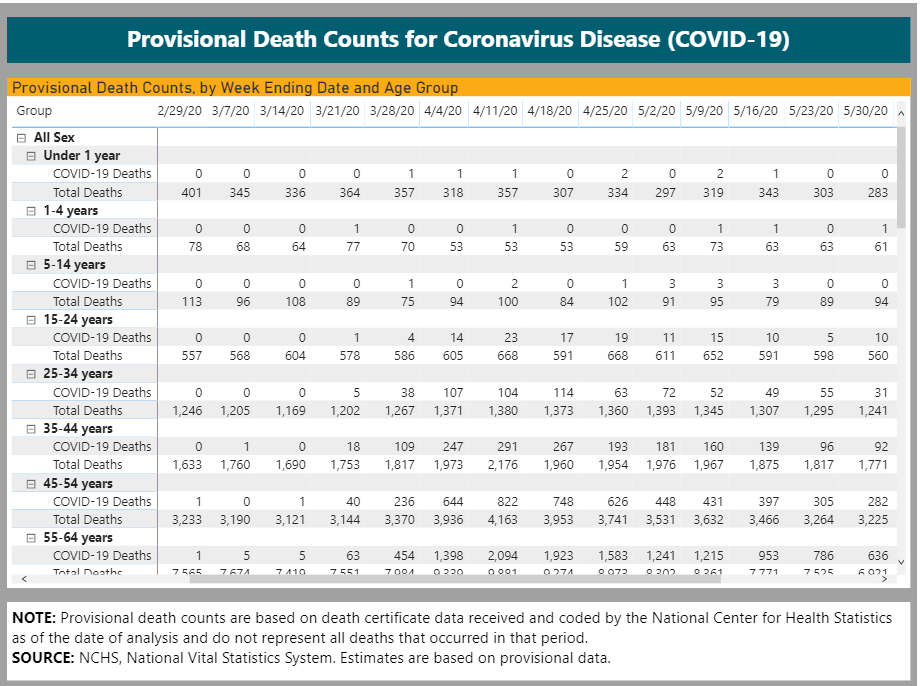 According to a report on ABC13.com, the Governor is now thinking about the idea of having kids stay home this fall. This would be the most ridiculous idea since COVID started. The 0-24 years old age group is the least affected of all the population. Do you know how many of these kids die every single week in the USA?? Around 1,000 of them die weekly from all causes. Accident/trauma is the leading cause. At the peak of the pandemic, the highest number of mortality for this group was 27 deaths for one week. That is 2.7% of all 0-24 years old deaths for that week of April 11th, 2020. The average was more around 1.5% of all deaths for April-May. The flu has more chance to kill your kids even with a vaccine. During the 2018-2019 flu season, the CDC reports 477 deaths for the 0-17 age group in the USA. So far for COVID, less than 200 deaths are reported for, not the 0-17 group, but the 0-24 group. Look at the mortality rates for the graph below. Have we ever shut down the economy for that??